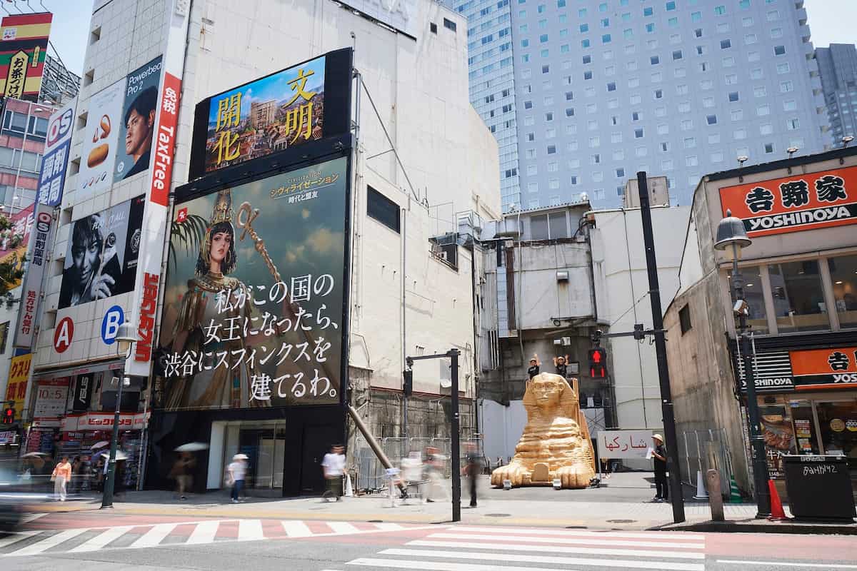 2025年6月、2Kの新作スマートフォンゲーム『シヴィライゼーション:時代と盟友』のプロモーション施策として、渋谷に高さ約4メートルの巨大スフィンクス像が出現。足元のアラビア語看板には「拡散せよ」と記され、SNSでも話題を集めた。隣接するZeroBase渋谷には前日からクレオパトラのビジュアル広告を掲出し、翌日にスフィンクスを登場させる二段構えの仕掛けに。日中はスフィンクスに登って撮影が可能で、夜間にはライトアップによる幻想的な光景が演出された。