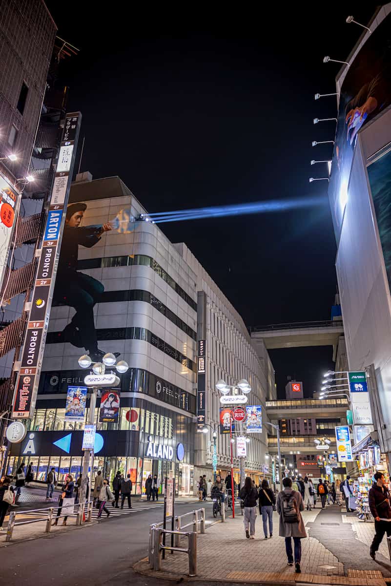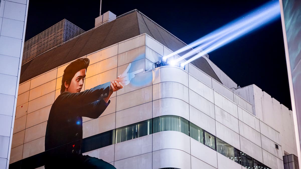 Netflixシリーズ『幽☆遊☆白書』の公開に合わせ、渋谷・井の頭通りに突如現れたのは、浦飯幽助と戸愚呂弟の死闘を再現した巨大なOOH。向かい合う2棟のビル壁面に両者を描き、サーチライトで幽助の必殺技「霊丸」を放つ演出を実現。毎日16時半から24時に光が走り、街ゆく人々を驚かせ、SNSでも大きな話題となった。