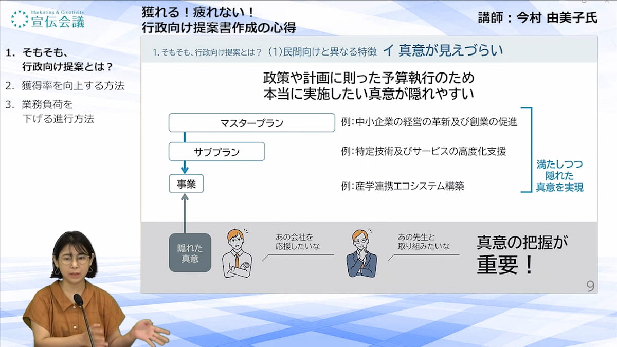 さらに今村氏は、行政の案件は政策や上位計画に基づいて実施されるため、担当者が本当に実現したい「隠れた真意」が存在することがあると指摘します。この真意を読み解くヒントも、多くはこの実施概要の中に隠されています。なぜこの事業が必要なのか、その背景にある社会的な課題は何かを考えながら読むことで、評価者の心に響く提案のストーリーを構築する糸口が見えてくるでしょう。