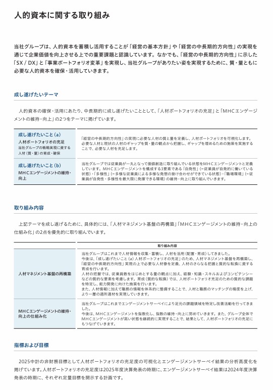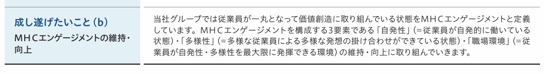 そうした中、三菱HCキャピタルは統合報告書で、人的資本に関して「成し遂げたいテーマ」を開示している。2024年版と2025年版を比較すると、図表が見やすくなったのみならず、エンゲージメントの「3要素」を際立たせることで、同社が重視するものが理解しやすくなった。