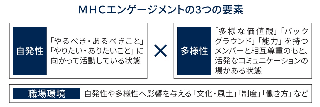 テーマのうちのひとつである「MHCエンゲージメントの向上」について、2024年版では「MHCエンゲージメントを構成する3要素」である「自発性」「多様性」「職場環境」を文章のみで記載していた。