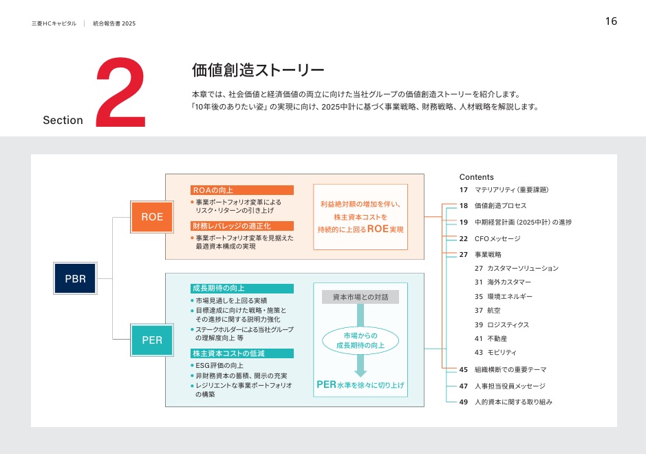 なお、「価値創造ストーリー」自体についても章のはじめに図表を掲載することで、人的資本に関する取り組みがPER(株価収益率)に影響することを示した。