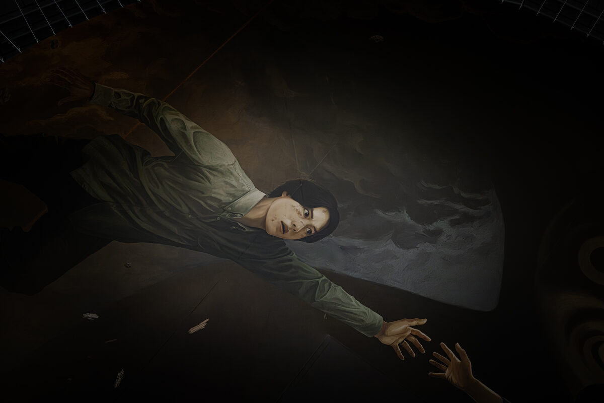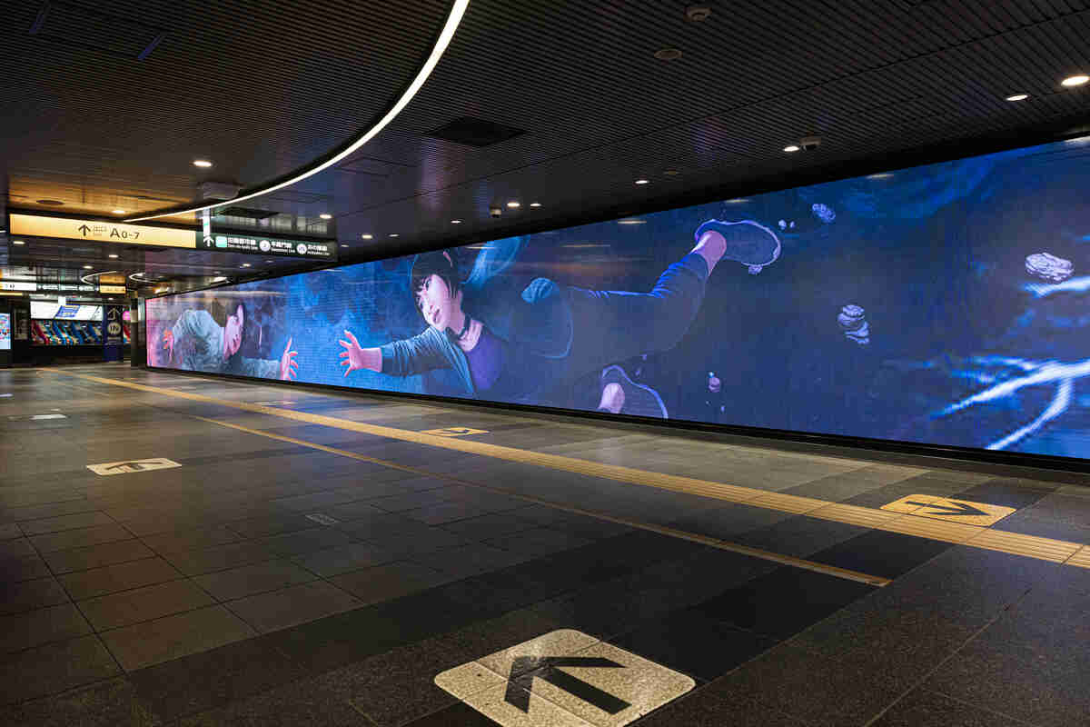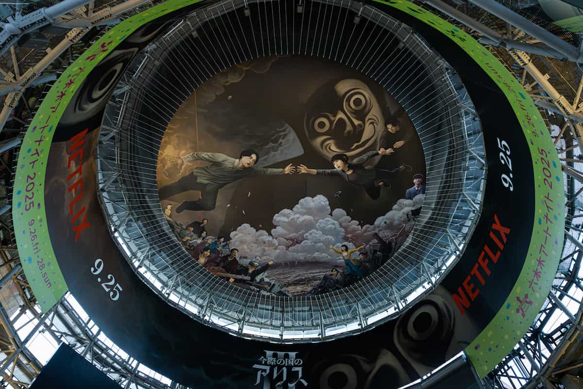 この新たなストーリーへの関心を最大化すべく、プロモーションを展開中。目玉として掲出されたのは六本木ヒルズのメトロハットの内周と天井幕のOOHだ。描かれているのは、主人公の「アリス」を演じる山﨑賢人と、そのパートナーで物語の鍵を握る「ウサギ」を演じる土屋太鳳、そして多様な出演者たちと、モチーフの数々。2人が互いに手を伸ばす構図は、さながらシスティーナ礼拝堂の天井に描かれた『アダムの創造』を彷彿させる。