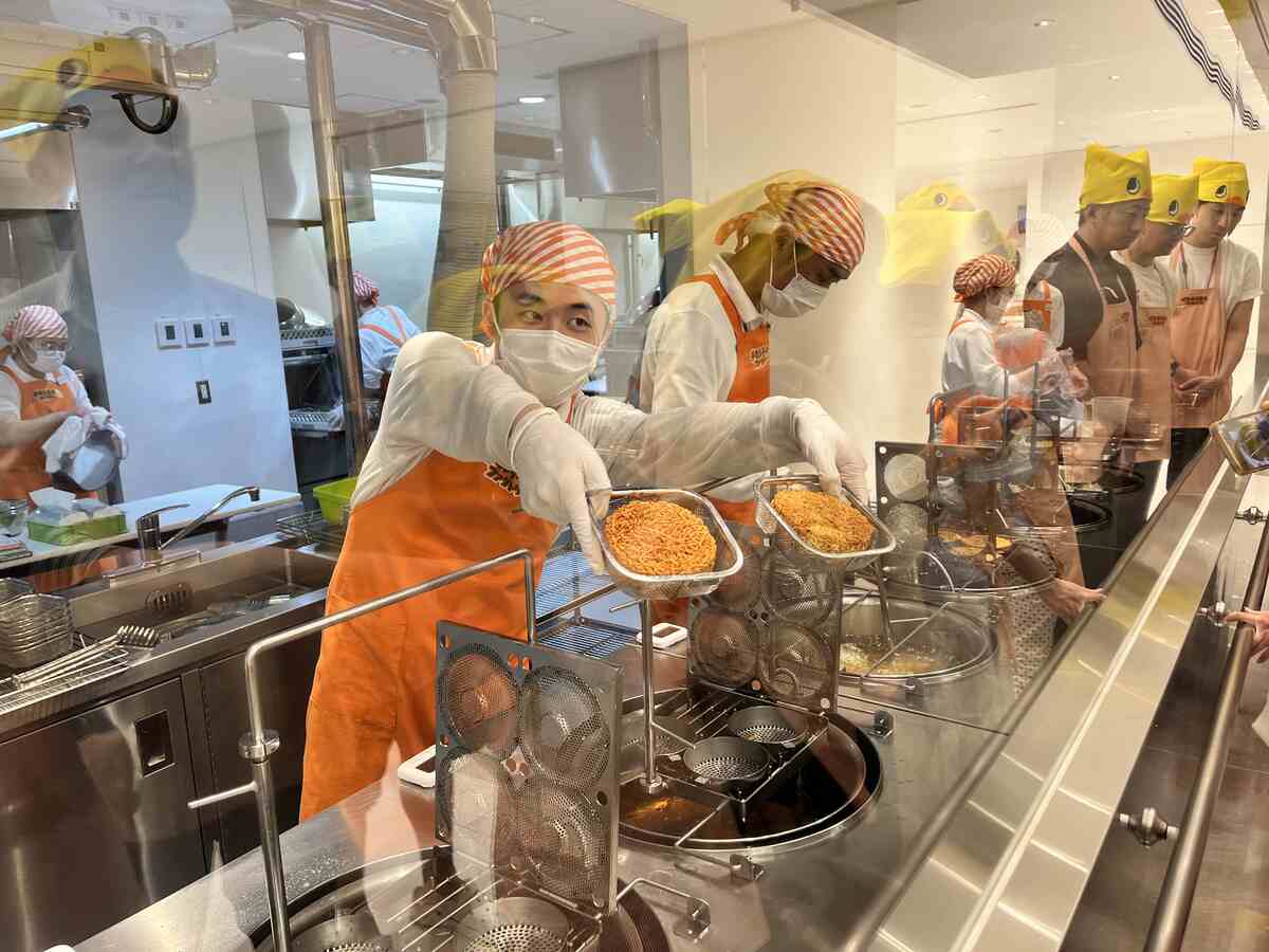 麺を蒸した後に味をつけ、型につめたら、作業は終了。スタッフの方が「瞬間油熱乾燥法」により、麺を油で揚げます。