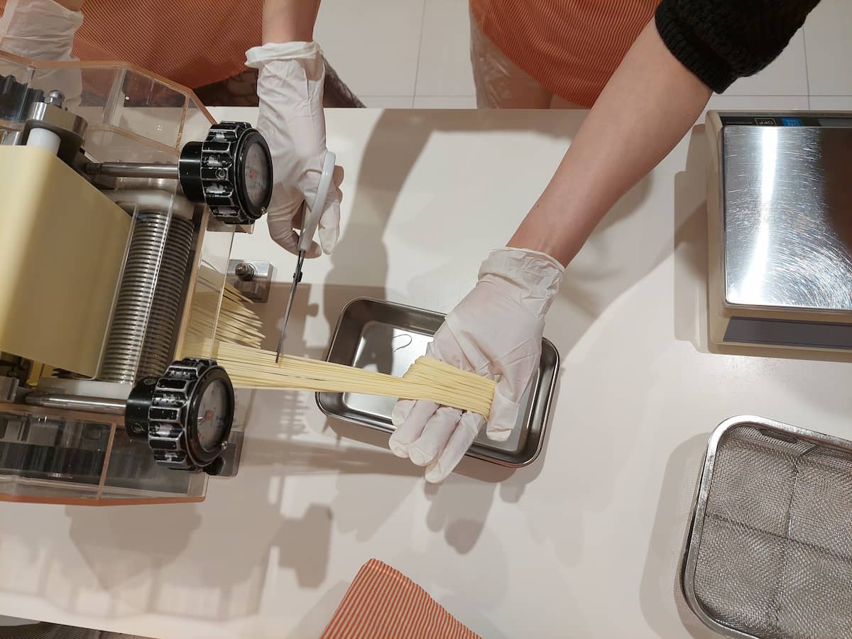 製麺機で生地を伸ばした後、麺を切り出していく。