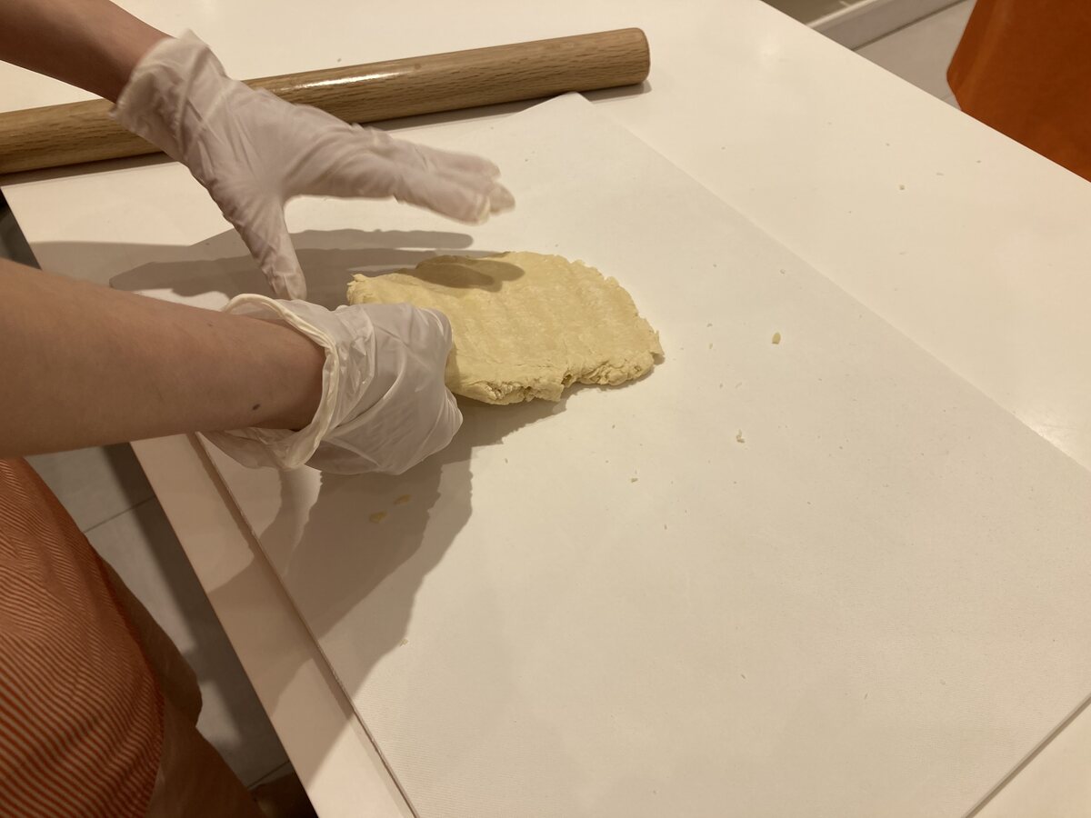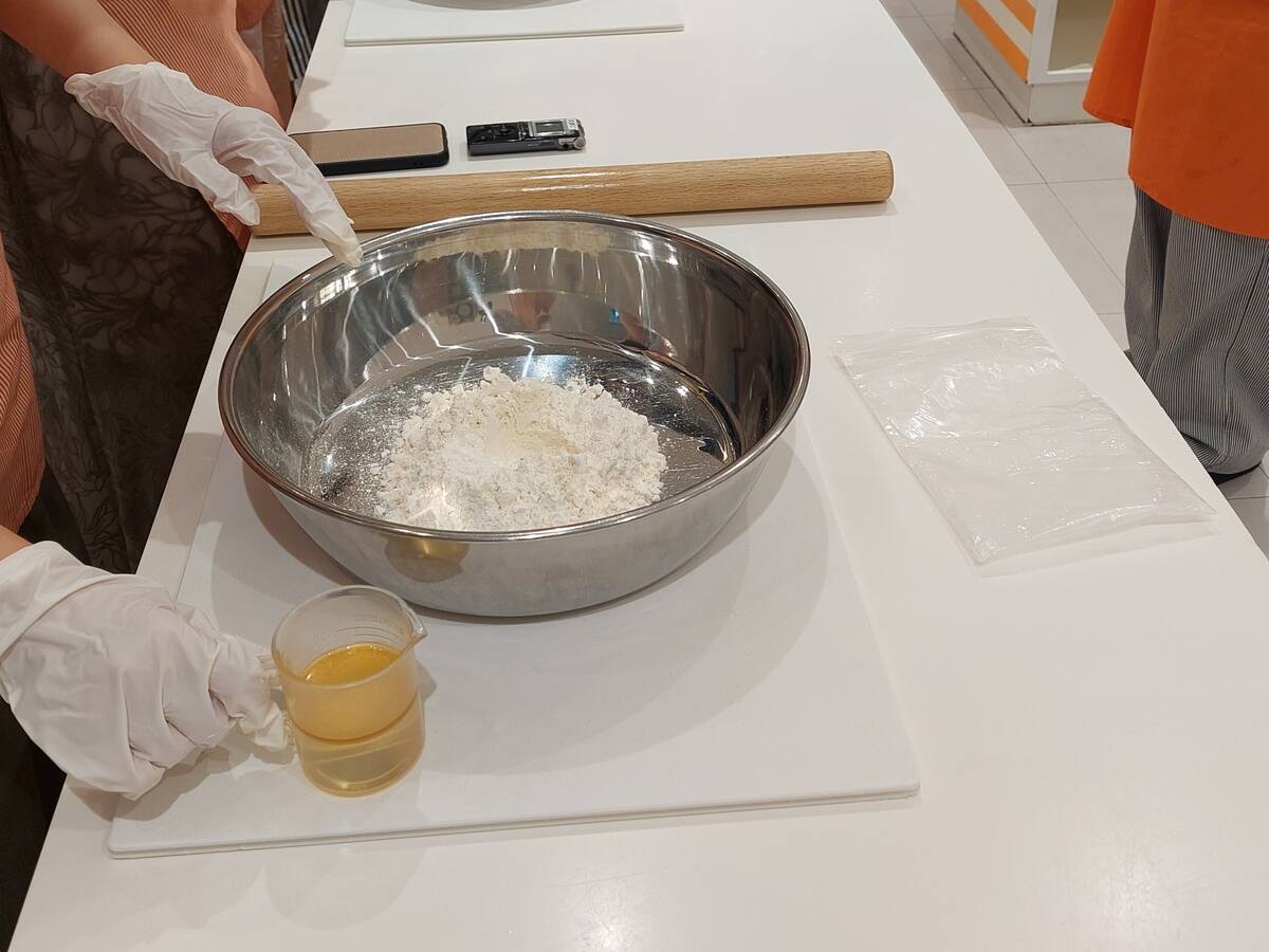 2人ペアになり、小麦粉を手でこねて生地をつくっていく。