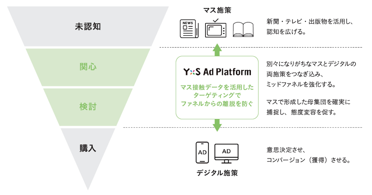 新聞+テレビの2大マス媒体のデータマーケティングを初めて実現した「YxS Ad Platform」は、別々になりがちなマスとデジタルの両施策をつなぎ込み、ミッドファネルを強化。