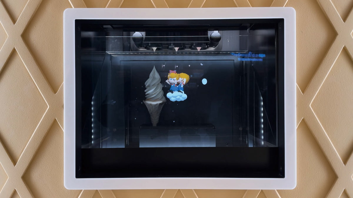 「将来、少子高齢化で省人化される未来も想像し、コーンを置いてボタンを押せば盛り付けまでが箱の中で完結するシンプルな設計にしました。お子さまやご年配の方、言語が違う方など、あらゆる方々に簡単にご利用いただけます。さらに、わくわく感や未来感は必要不可欠と考え、当社のキャラクターであるニックン&セイチャンの3Dホログラムが、盛り付けの様子を演出するプログラムを採用しました。世界各地から集まってきた方々や、子どもたちにとってソフトクリームにまつわる良い思い出を残したいと考えてのことです」。