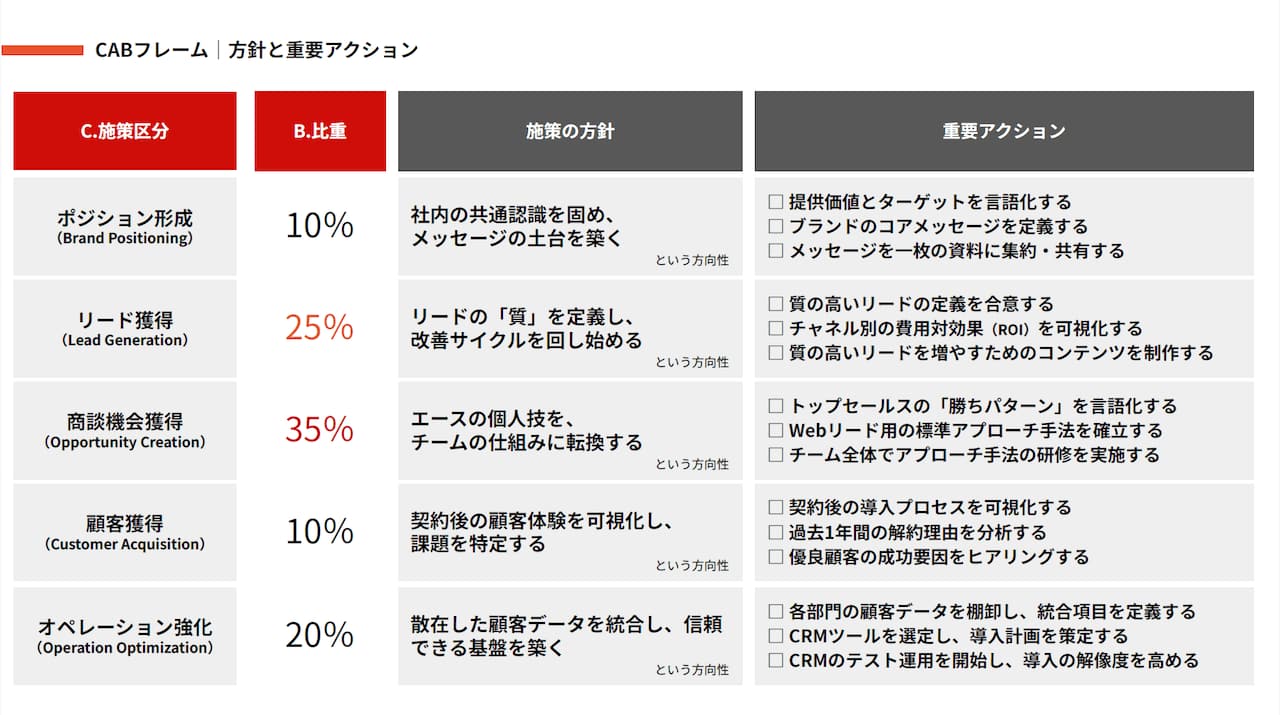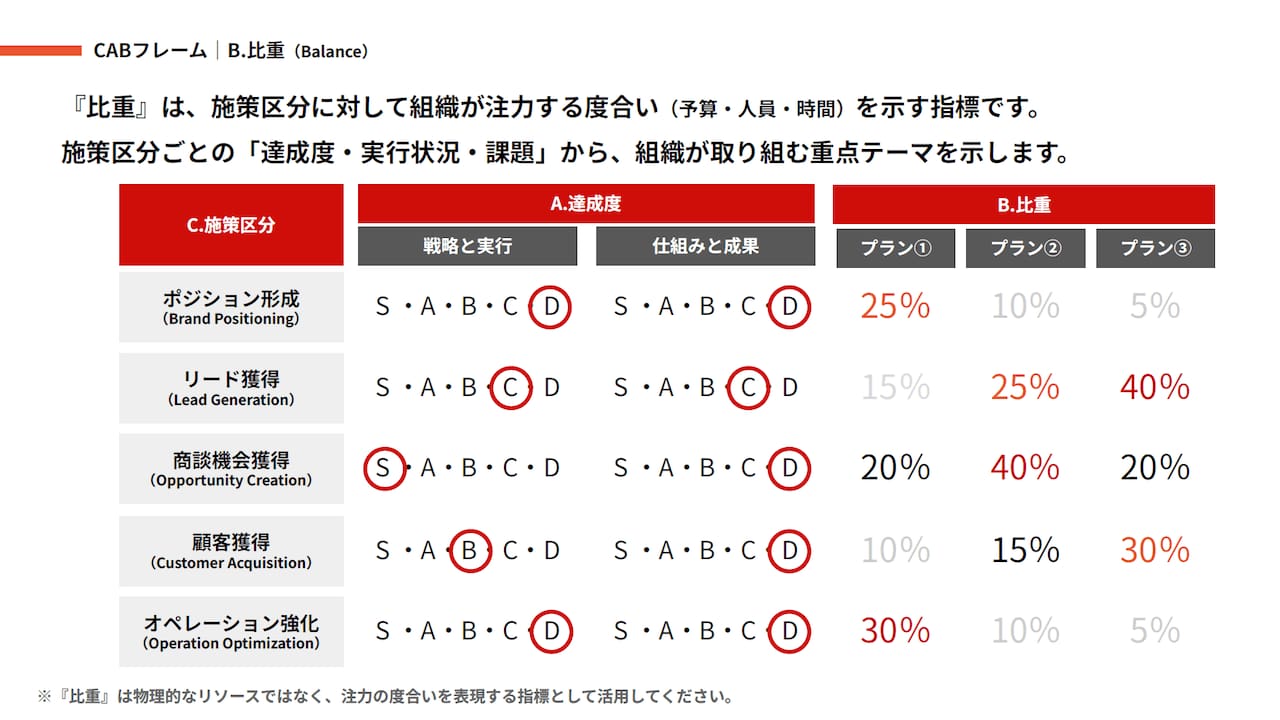各部門の合意形成を進める「CABフレーム」は、マーケティング施策を整理・評価・優先順位づけするフレームワークだ。C(Category)は施策の区分、A(Achievement)は達成度、B(Balance)は比重を表す。