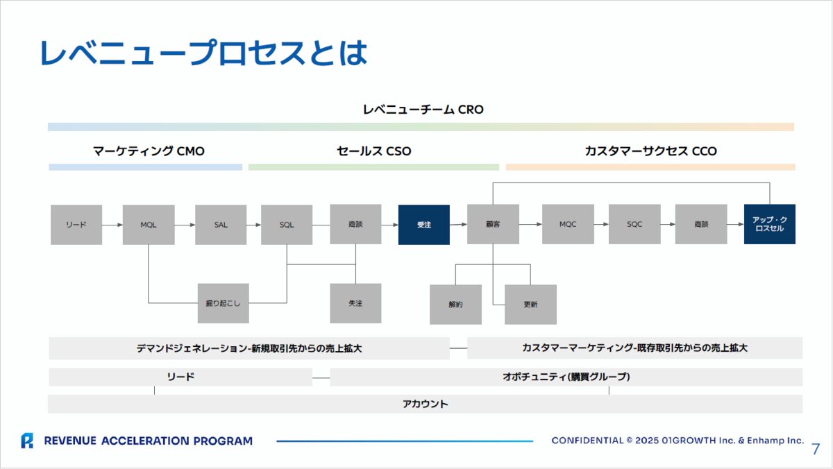 RevOpsは、顧客接点を担うすべての部門を1つの収益チームとして再設計し、データ・KPI・業務プロセスを横断的に統合管理することで、顧客体験と収益性を両立するオペレーション体制だ。マーケティングがリードを獲得し、営業が商談化・受注、カスタマーサクセスがアップセル・リテンションを担い、CROが統合管理する。しかし現実は、戦略やKPI、テクノロジーが部門ごとに縦割りで断絶してしまっている。川上氏は「部門間の壁を越えた協業なくして持続的成長はない」と強調する。