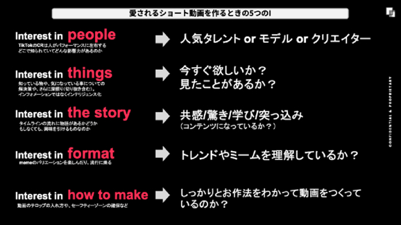 これらの問いに答えることで、企画はより立体的で、魅力的な炎となって燃え上がります。ショート動画の企画を作ったらこの5つが抜け落ちていないかをチェックします。逆に、人気のある動画やアワードの受賞作品はどういったところがこの5つに当てはまっているのかをデコンする練習もしています。意外と腹落ちしやすく、手っ取り早く習得しやすいフレームです。