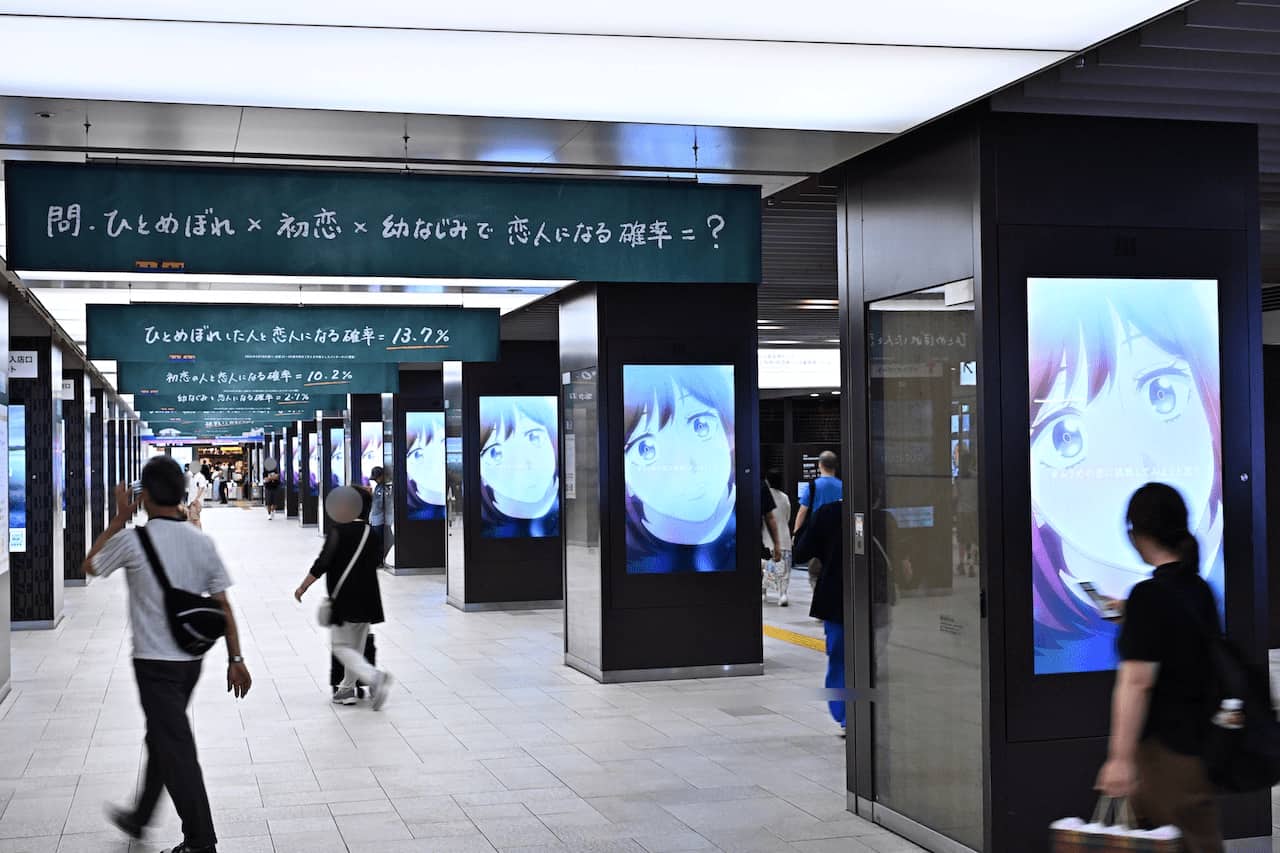 アニメの聖地ともいえる池袋では、JR池袋駅北改札外にあるJR東日本 池袋駅 パノラマ池袋Aで「ひとめぼれ」×「初恋」×「幼なじみ」をベン図にした問題風の広告を掲出。
