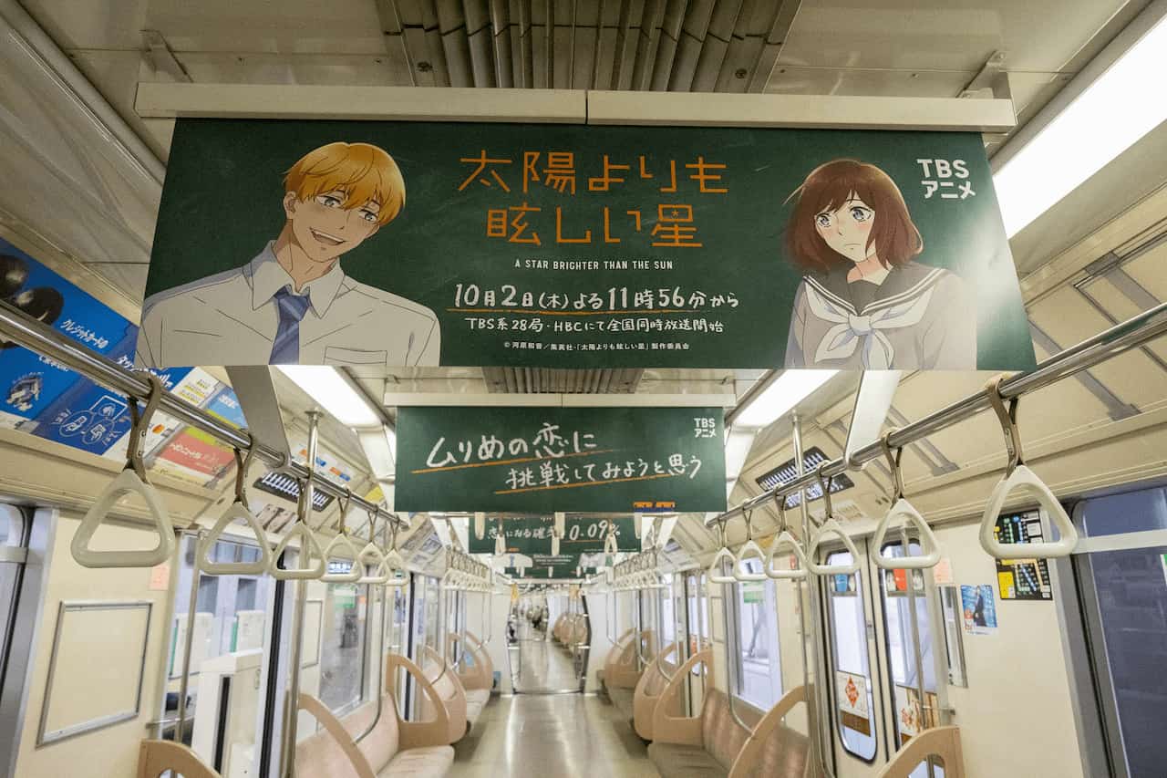 さらに本作の舞台となる札幌では、札幌市営地下鉄の全線・全車両の中づり6カ所の片面をジャックした。©河原和音/集英社・「太陽よりも眩しい星」製作委員会