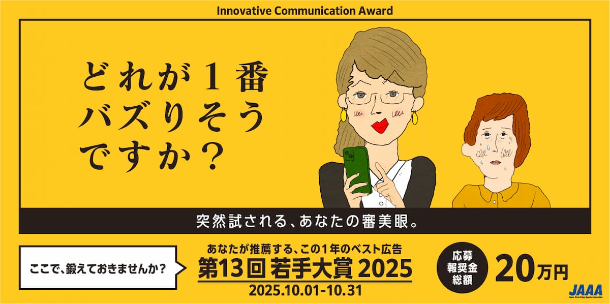本賞は、広がるコミュニケーションビジネスの新たな可能性を提示し、広告業界活性化の一助とすることを目的に、2013年に創設。今年で13回目を迎える。応募資格は、JAAA会員社に所属する、30 歳以下の社員。審査員も会員社から選出された広告業界の若手メンバーが務める。
