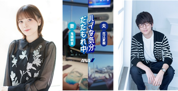 全日本空輸(ANA)は、声優の花江夏樹と鬼頭明里を夫婦役で起用したSNSムービーを、10月1日から公開している。タレントの西山智樹と前田大輔を起用したテレビCMも展開しており、いずれも飛行機に乗る際の「高揚感」をテーマとしている。旅行需要を促進するため、旅先ではなく、搭乗体験そのものの魅力を伝える狙いがある。