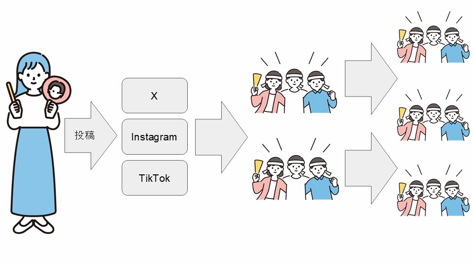 SNS時代のファンによる拡散イメージ。1人の投稿が新規ファン層を取り込む手段として機能。なかでもTikTokでのダンスチャレンジやショート動画は、企業の広告に匹敵する影響力を持つこともある。