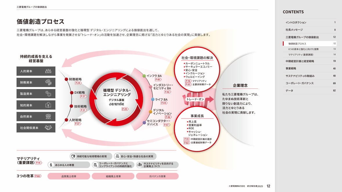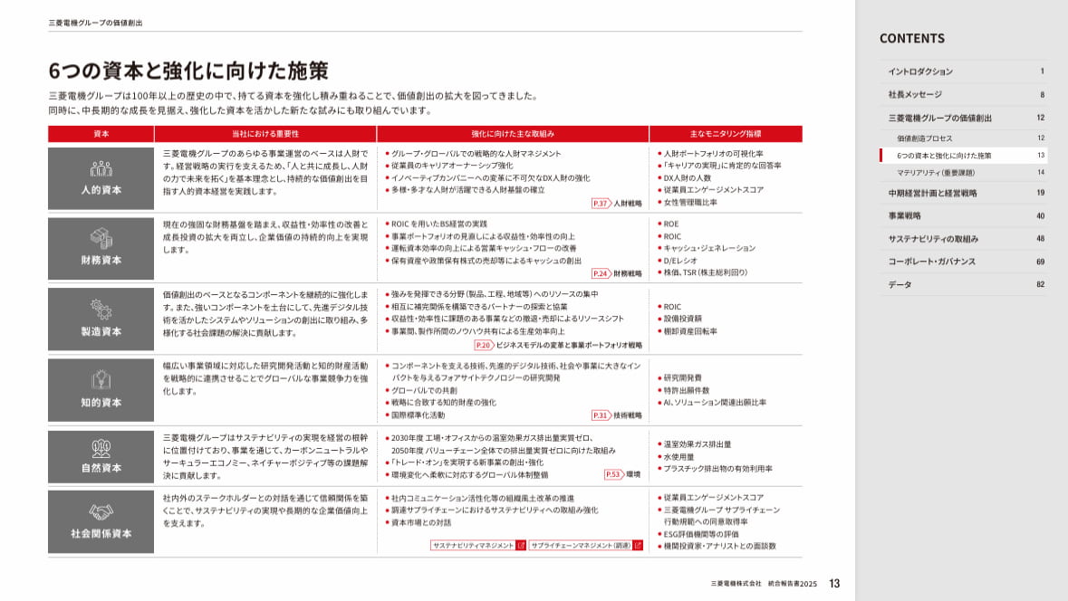 この点、2024年版の統合報告書と比較すると、「価値創造プロセス」の中で各資本を示すのは同じだが、2025年版では各資本に関する説明や取り組みを一覧で示している点が新しい。