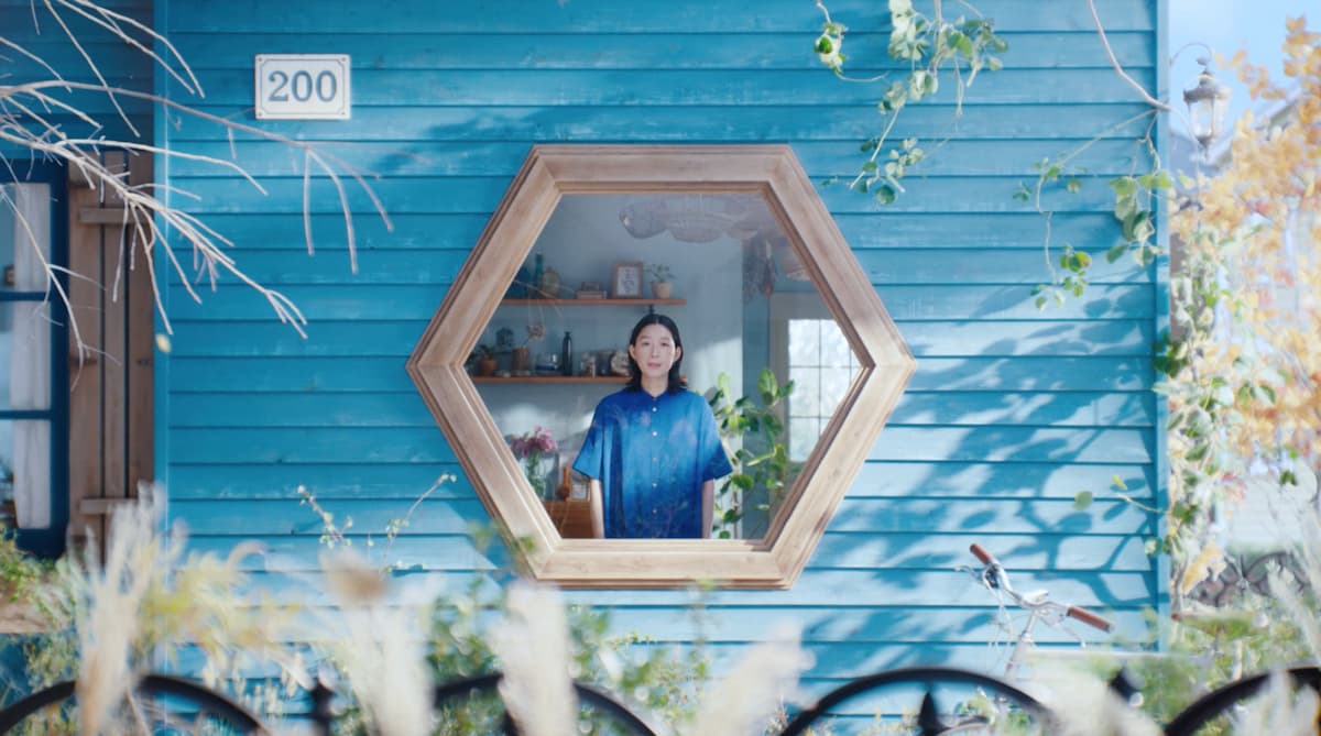 CMはマフラーや厚着をした人々が寒空の下で通勤・通学する中、ブランドカラーの青と六角形の窓枠が印象的な家の中から江口が語りかけるシーンで始まる。