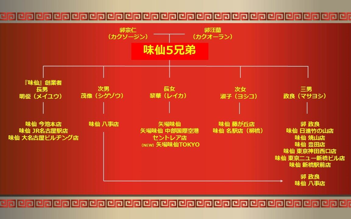 味仙「5系統」発祥の歴史・出店についてアドタイ編集部で作成。各店舗でメニューや味付けが異なる。三男・郭政良の系列で神田/新橋に東京初進出している。今回の渋谷に出店する店舗は長女・郭黎華の矢場味仙。