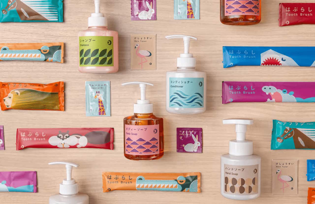 「龍宮亭」のアメニティ。歯ブラシの外袋のデザインは、歯に特徴のある動物をモチーフとし、ヘアブラシの外装のデザインは、毛に特徴のある動物をモチーフとした。