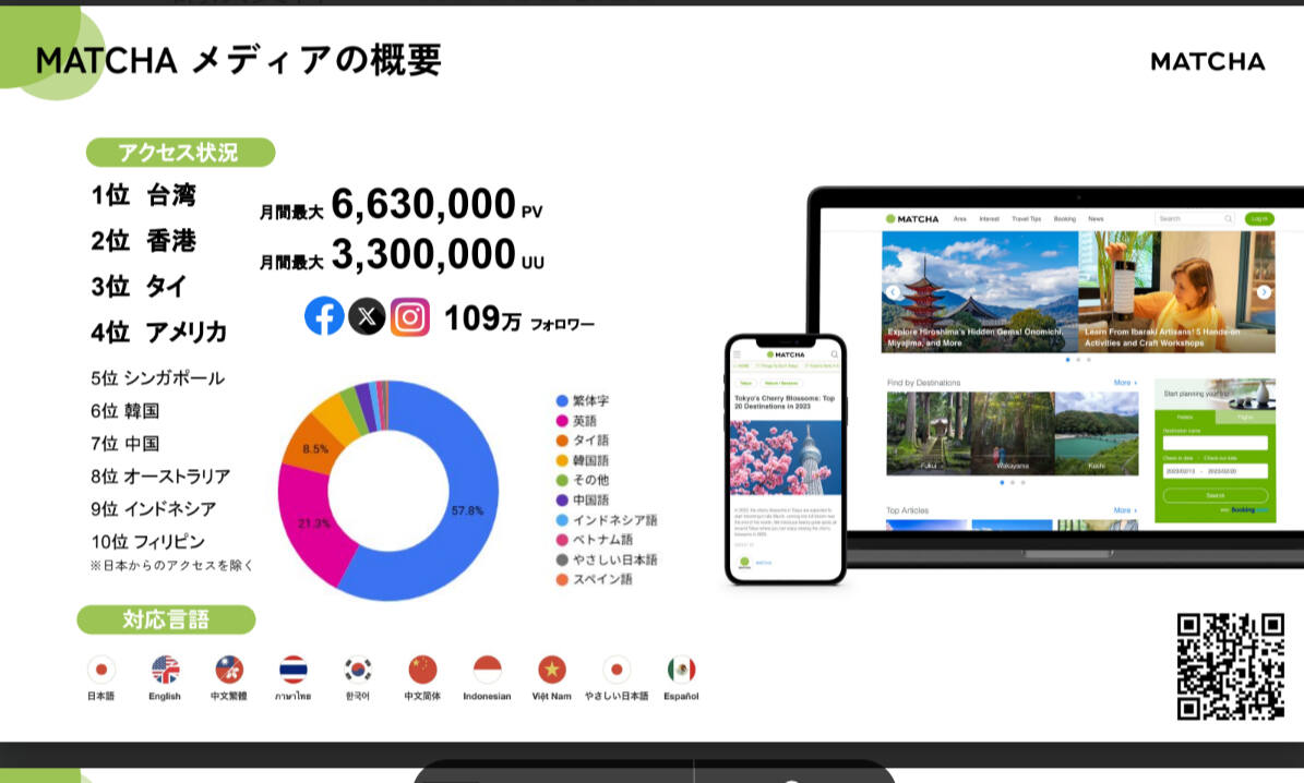 訪日外国人観光客向けメディア「MATCHA」は、10言語で日本の情報を発信し、月間最大300万人超のアクセスがある。特に台湾、アメリカ、アジア圏で強く、訪日リピーターが多い台湾のユーザーと、初来日の可能性が高いアメリカのユーザー向けにそれぞれ提供する情報を変えるなど、ターゲットの習熟度に合わせたきめ細やかなコンテンツ発信が特徴だ。
