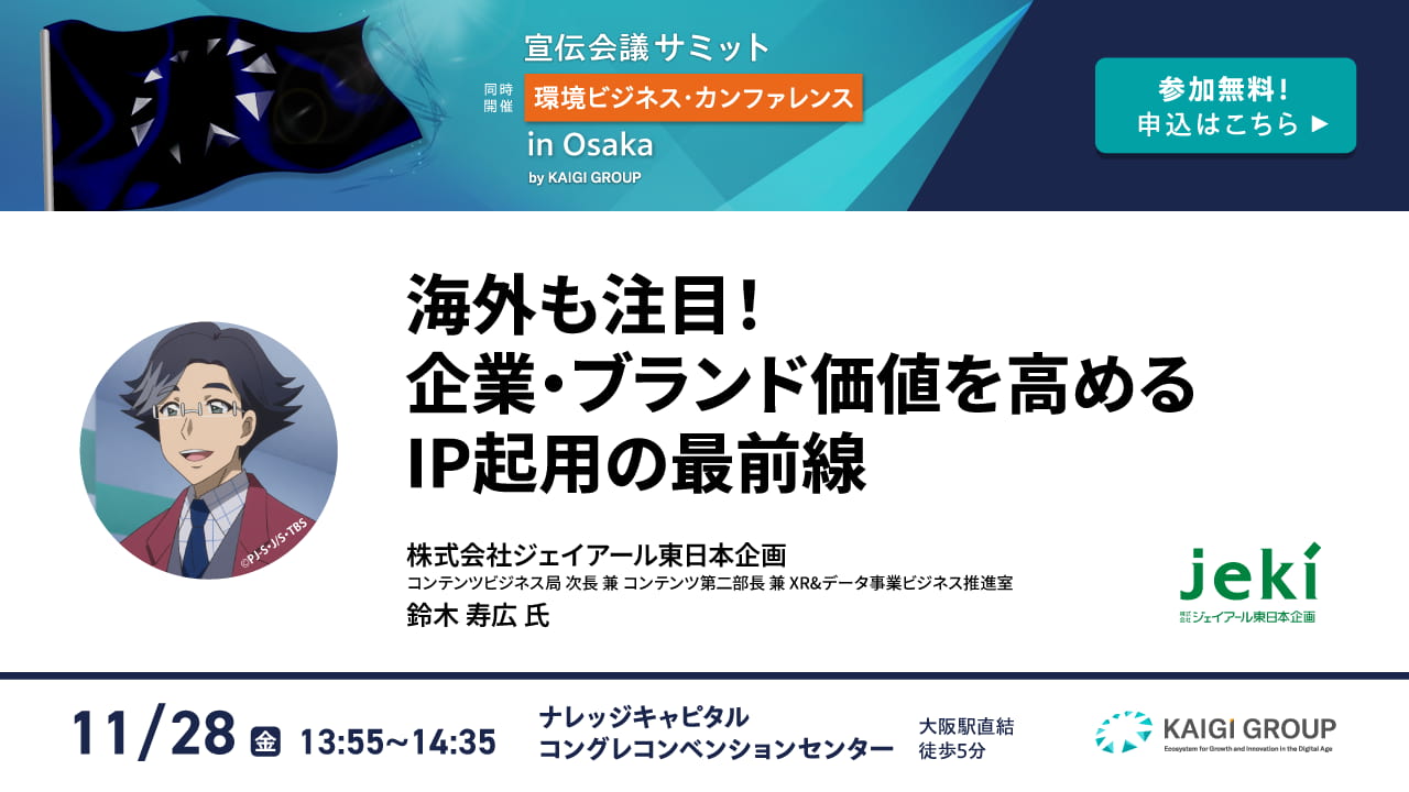 アニメ・キャラクター・映像コンテンツは、推し活や聖地巡礼が一般化する中、人々の心を動かし、購買・行動意欲を強力に喚起する存在へと進化しています。プロモーションに起用すれば企業にとって強力な武器である一方、扱いを誤れば炎上や反感を招くリスクも。本セミナーでは、jekiの実績と最新事例から成功の秘訣をひも解き、未来のプロモーション戦略に役立つ視点をご提供します。