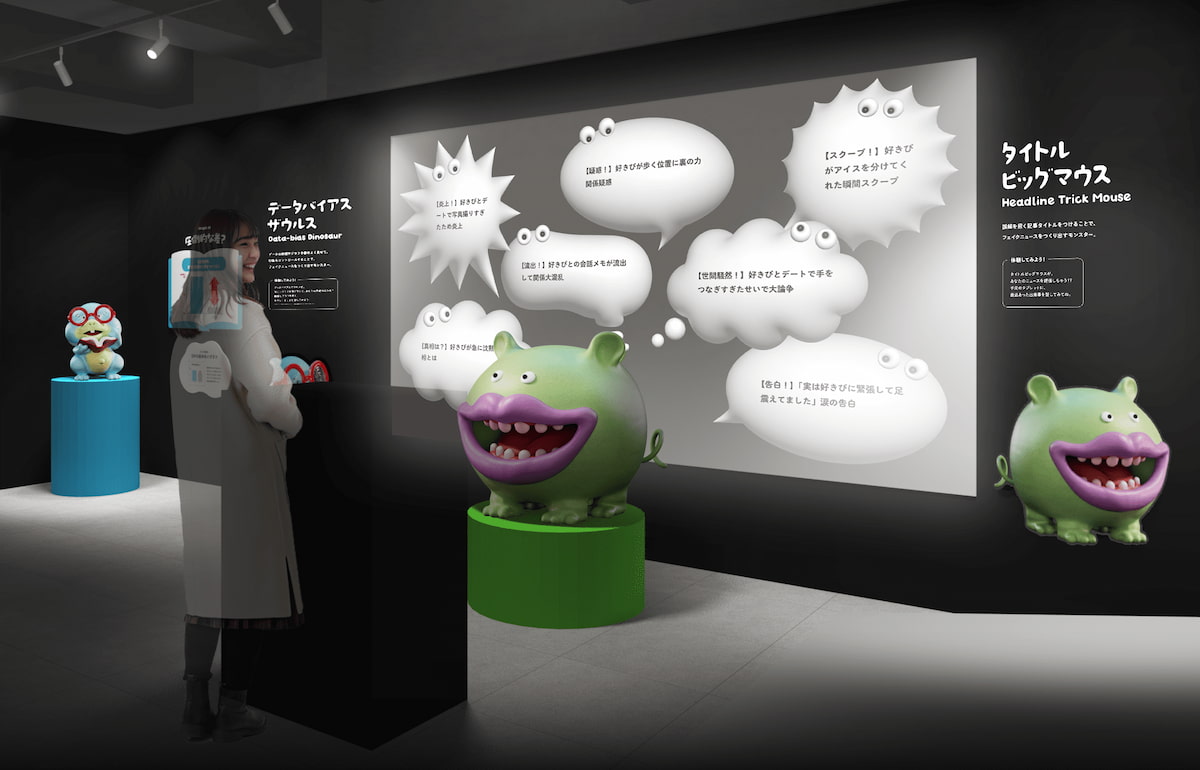 同イベントでは、フェイクニュースの仕組みを“モンスター”に見立て、「タイトルビッグマウス」「データバイアスザウルス」「AIイリュージョニスト」「キリヌキザリガニ」など全10種類のモンスターが登場し、そのうち4種は体験型展示となる。来場者は誤解を招く記事タイトルの疑似体験や、AIによる偽画像生成の仕組みなどを楽しみながら学ぶことができる。