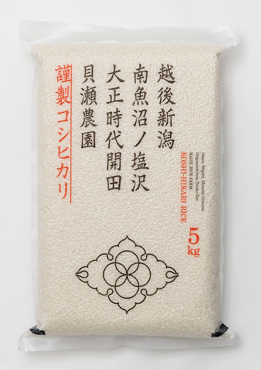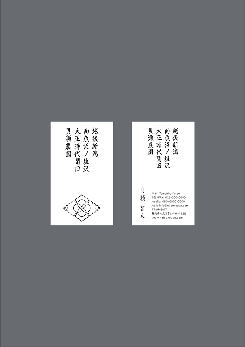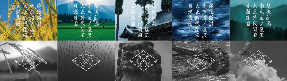 「越後新潟南魚沼ノ塩沢大正時代開田貝瀬農園」の米袋と名刺のデザイン
