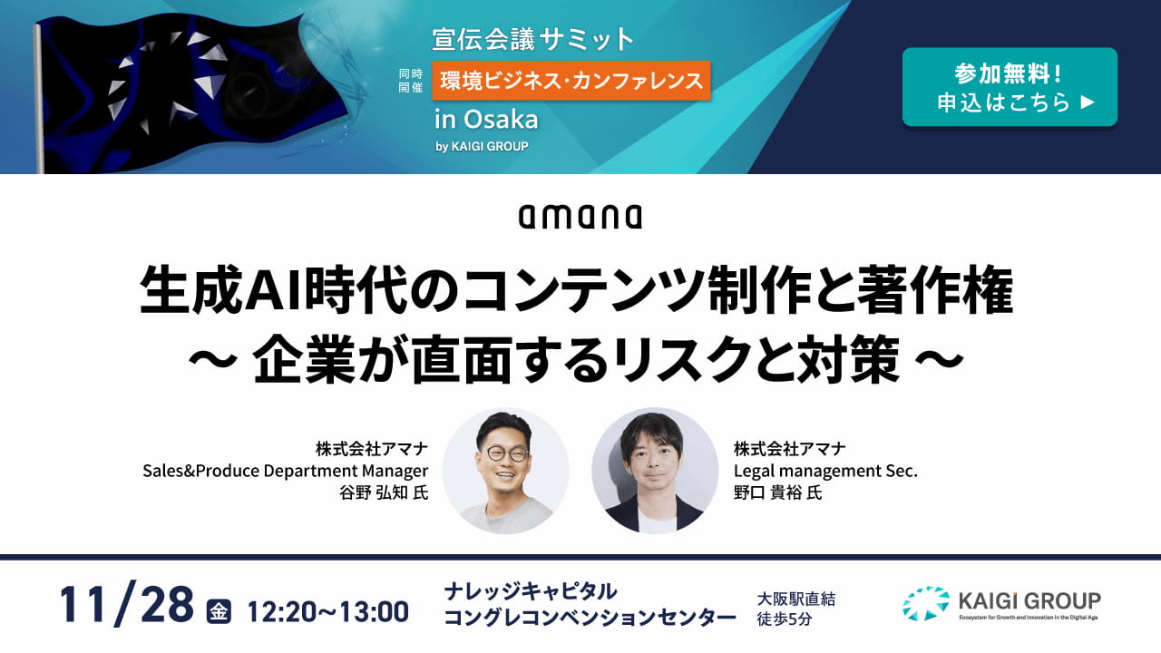 生成AIの普及により、マーケティング現場でのコンテンツ制作は劇的に変化しています。しかし、権利侵害リスクへの対応が企業の競争力を左右する時代に突入しました。アマナが長年のクリエイティブ実務で培った知見をもとに、著作権・AI権利の「守り」を「攻め」の戦略に転換する具体的手法を、豊富な事例とともに解説。明日から実践できるリスクマネジメントフレームワークをお伝えします。