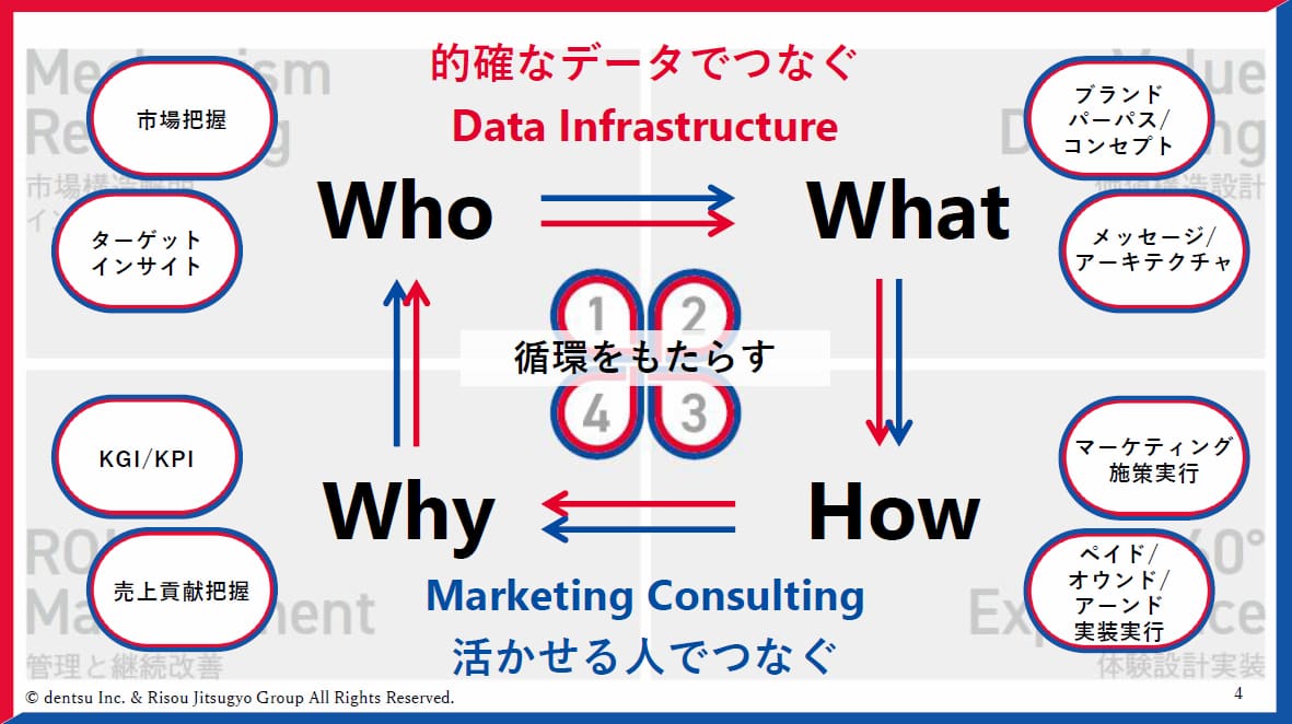 セッションの冒頭、深田氏は電通が提唱する次世代マーケティングモデル「Marketing For Growth」を紹介した。これは、分断されがちな「Who(誰に)」「What(何を)」「How(どのように)」「Why(なぜ売れたか)」というマーケティングの各プロセスを、データとそれを活用できる「人」によってシームレスにつなぎ、事業成長に貢献するという思想だ。