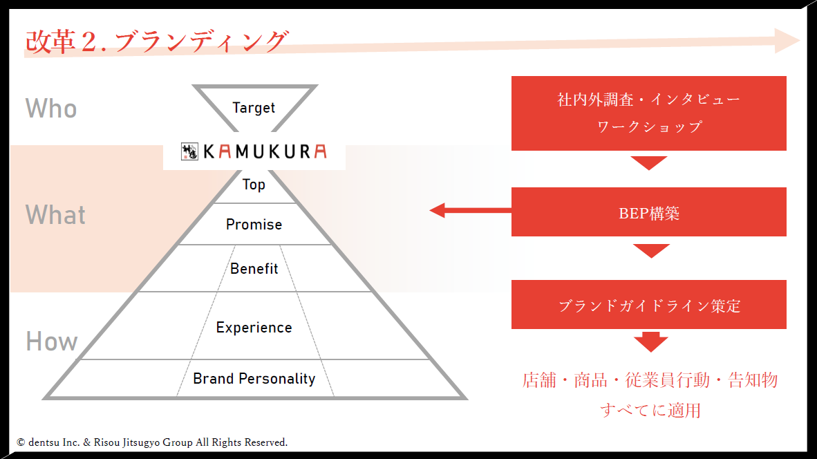 2つ目の柱の「ブランディング」では、ブランド不在という課題に対し、まずは「神座ブランドとは何か」を言語化・規定することから着手。藤田氏は「社内外の調査やインタビュー、ワークショップを重ね、ブランドの骨格となるBEP(ブランド・エクイティー・ピラミッド)を構築しました。これがすべての顧客接点の基礎となります」と説明する。