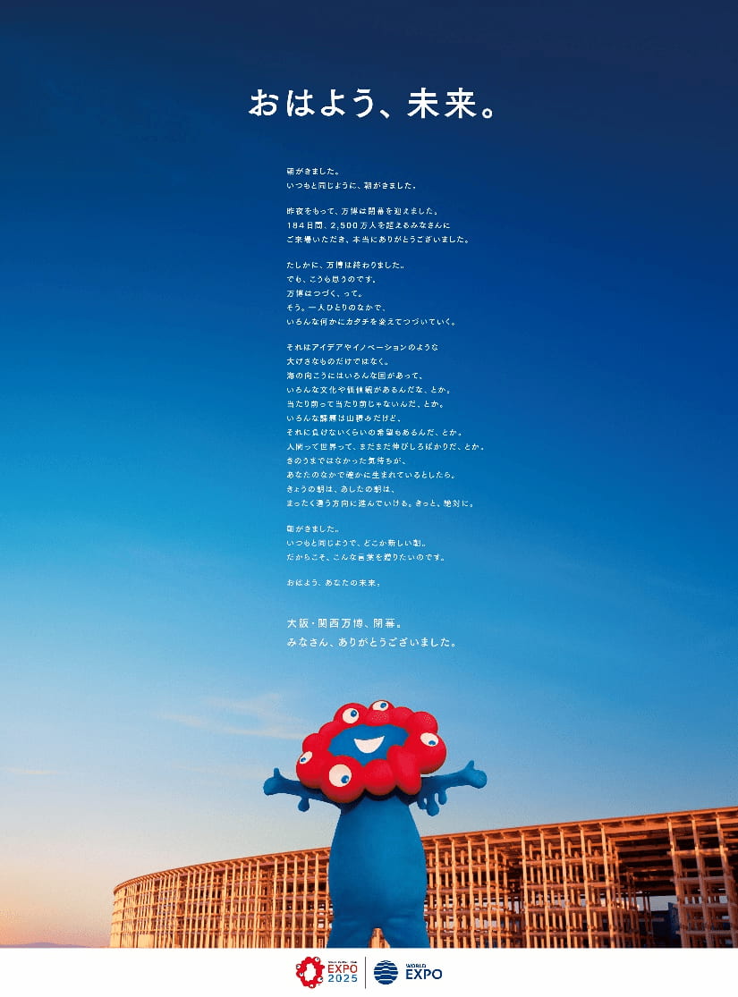 澄み渡った清々しい青空の下、ミャクミャク、大屋根リングとともに「おはよう、未来。」というコピーから始まるこの広告はどのように生み出されたのだろうか。ボディコピーの全文は次のとおり。