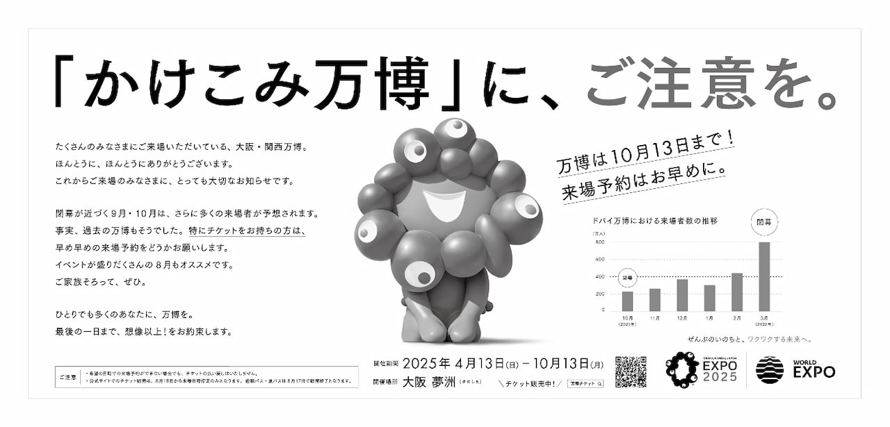 2025年⽇本国際博覧会協会は「大阪・関西万博」閉幕の翌朝にあたる10月14日、閉幕御礼広告を全国紙朝刊に出稿した。掲載媒体は日経、読売、朝日、毎日、産経。