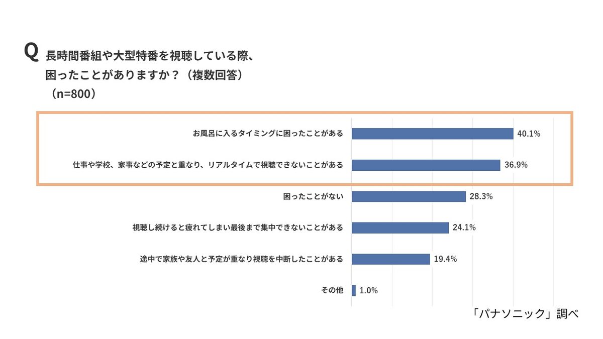 また、年末年始や改編期に多い長時間番組や大型特番の視聴時には、「お風呂に入るタイミングに困ったことがある」(40.1%)が最も多く、「仕事や学校、家事などの予定と重なり、リアルタイムで視聴できないことがある」(36.9%)が続いた。リアルタイムで見たいという強い意欲が、生活リズムにも影響を与えているようだ。