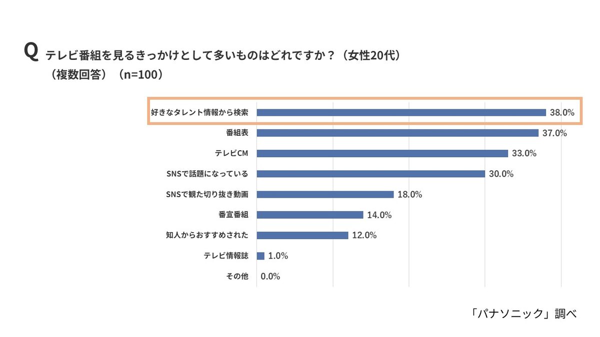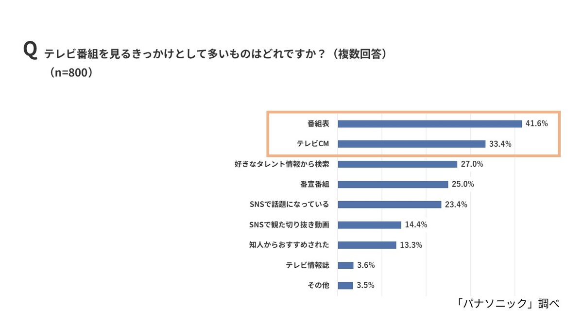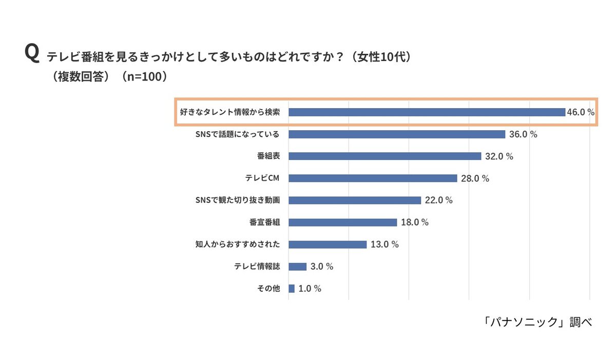 番組視聴のきっかけとして、全体では「番組表」(41.6%)、「テレビCM」(33.4%)が上位を占めた。一方、10代女性(46.0%)と20代女性(38.0%)では「好きなタレント情報から検索」が最多となり、Z世代女性の視聴行動にも“推し活”の影響が色濃く表れている。