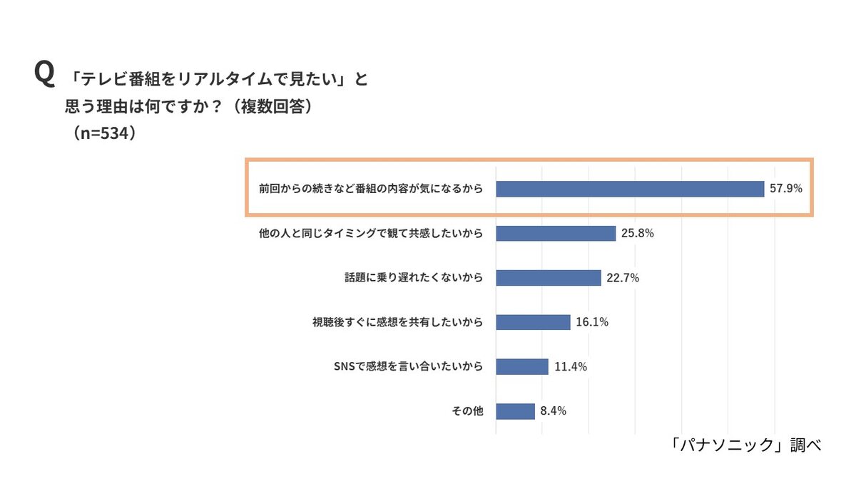 リアルタイムで見たい理由としては、「前回からの続きなど番組内容が気になるから」(57.9%)が最多。次いで「他の人と同じタイミングで見て共感したいから」(25.8%)、「話題に乗り遅れたくないから」(22.7%)が続いた。番組内容への関心に加え、共感や情報共有といったソーシャルな動機も大きいことが分かる。