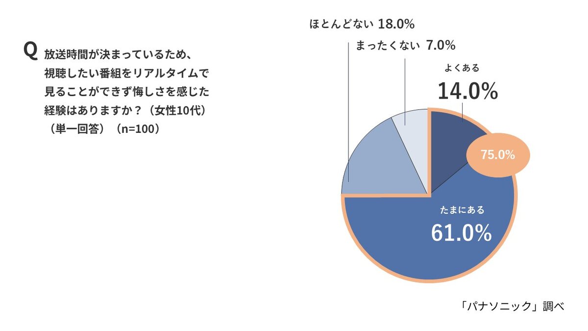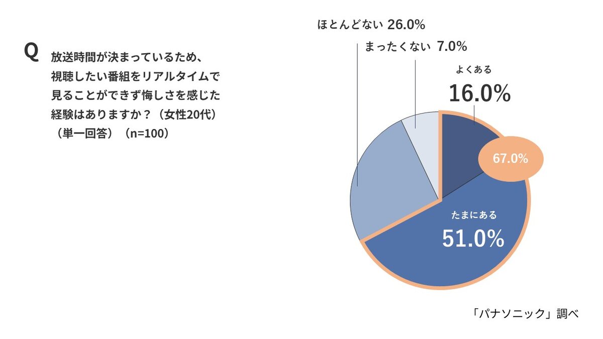 「放送時間が決まっているため、見たい番組をリアルタイムで見られず悔しい思いをしたことがある」と答えた人は全体の58.1%。特に10代女性(75.0%)、20代女性(67.0%)では、その割合が高かった。