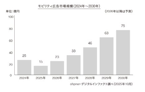 トラック車体を広告媒体(アドトラック)として活用する広告手法。これまで都市部での高い視認性や、ターゲットエリアを自在に移動できる到達力、手頃な出稿価格を強みに支持を集めてきた。近年では上場企業やグローバルIP企業など、これまでにない新しい業界・ブランドからの関心も高まっている。市場規模は、2024年に東京都が規制や審査の厳格化したことで、2024年から2025年にかけて需要は一時的に減少したものの、公的な規制をクリアした「モビリティ広告」の登場により、2025年の市場規模は前年比60%の15億円に。2030年には75億円に到達、2025年比で5倍に成長すると予測されている。