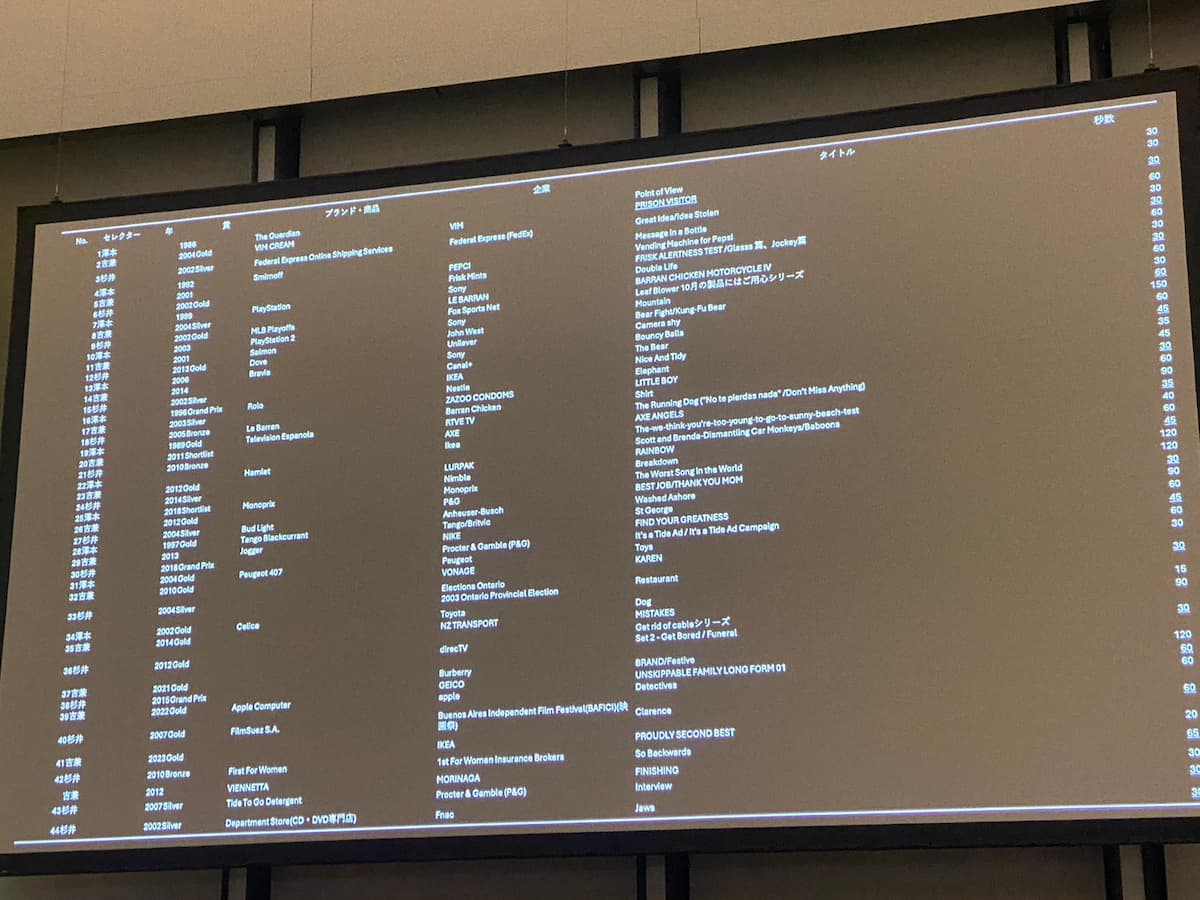 セッションでは、3人がそれぞれ10本超、合計44本のフィルム部門受賞作品の中から、時間の許す限り作品を上映し、語り合う形式で進行。澤本氏は、吉兼氏と杉井氏を招いた理由を「つくってるCMが面白いからです。2人に後ろから追い抜かれた感じもあるので、ちょっと僕は抜き返そうと思って」とユーモアを交えて語った。