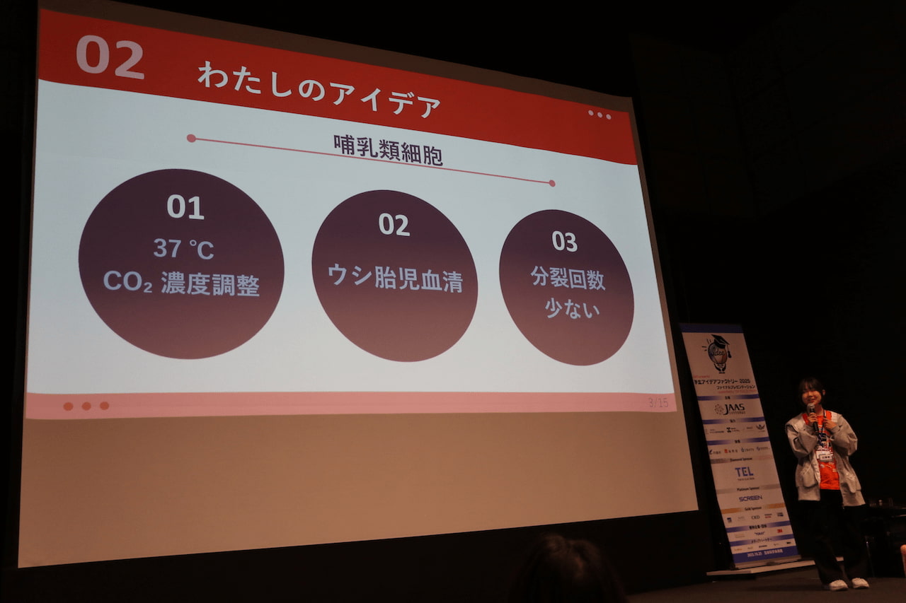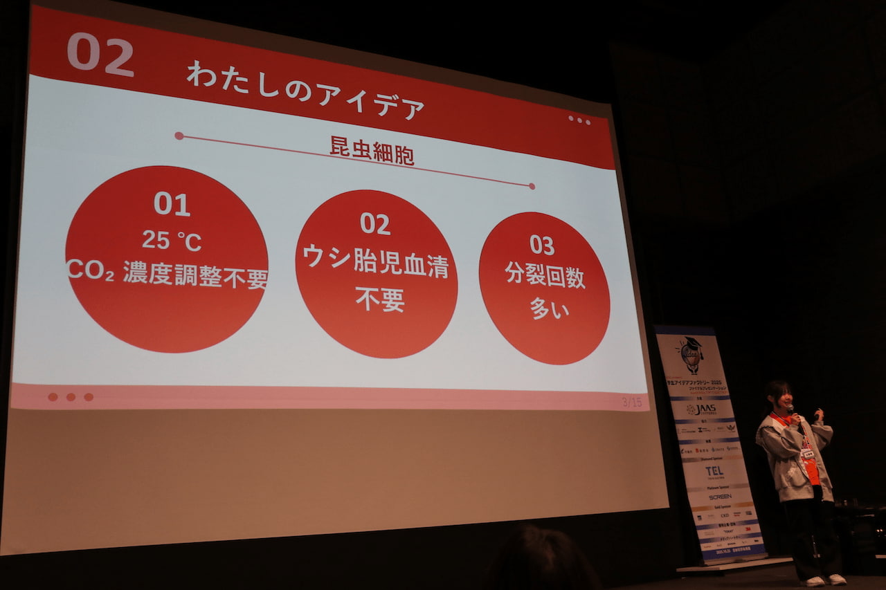 3年目の今年の最高賞(JAAS賞)には、九州大学工学部の中桐真珠子さんの「昆虫細胞を用いた未来型ロボット開発」が選ばれた。プレゼンで中桐さんは「高校2年生の時に鶏の細胞を取り出して、その細胞から肉を培養するというSFのような話を知り、心が奪われました。そこから趣味でずっと細胞培養をしてきました。いまは工学部で細胞を利用したい気持ちが強くなり、材料としての細胞に目を向けて考えたのが、“昆虫細胞を用いたロボット”でした」と着想のきっかけを話した。哺乳類・鳥類細胞は培養時にさまざまな難点があるが、昆虫細胞は培養しやすくバイオロボティクスに有用と提言。今後はカイコ(繭)を用いて培養を進めて筋分化を図っていくと研究プロセスを語った。