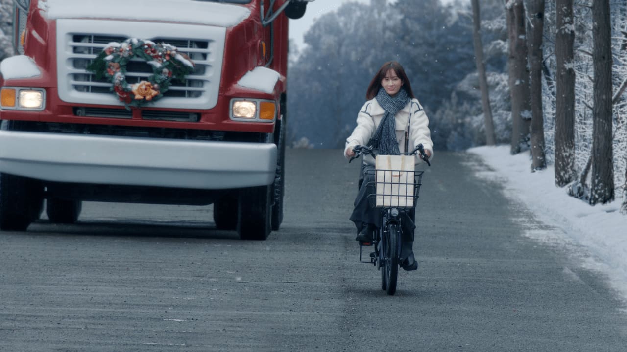 WebCMは、雪景色の一本道をママチャリで走る前田さんの姿から始まる。自転車のカゴにはホリデーギフトのバッグ。部屋に戻り、ドレッサーの前で箱を開けると、「N organic Vie ヒアルアップ リフトクリーム」が現れる。「一年間頑張った、肌と私にご褒美を。」というナレーションとともに、雪の静けさとホリデーの特別感が印象的に描かれている。
