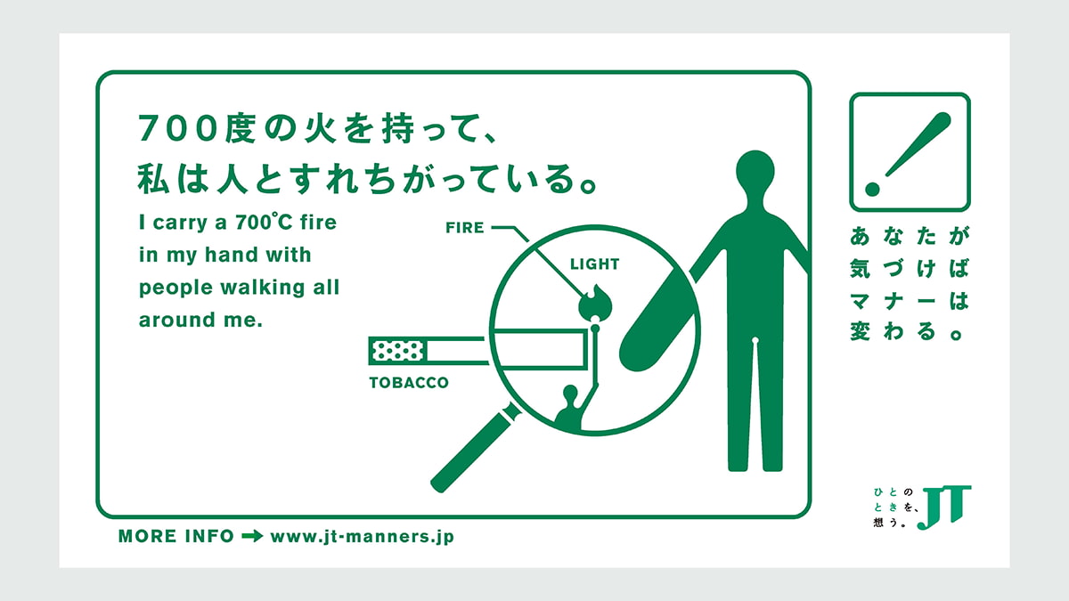 同じく広告主からのオリエンを岡本氏が“ひっくり返した”事例として、日本たばこ産業のマナー広告「あなたが気づけばマナーは変わる。」が紹介された。現在もつづくこのキャンペーンが始まったのは、歩きたばこや吸い殻のポイ捨てが社会問題化しつつあった2000年ごろ。たばこを買う顧客という、企業にとって最も大切な存在にマナーを注意することは「どんなクライアントでもやりたがらない」。だが、吸わない人も含めた世の中全体を考えた広告が「この時代に一番言わなきゃいけないこと」だという岡本氏の思いが、オリエンをひっくり返した動機だった。