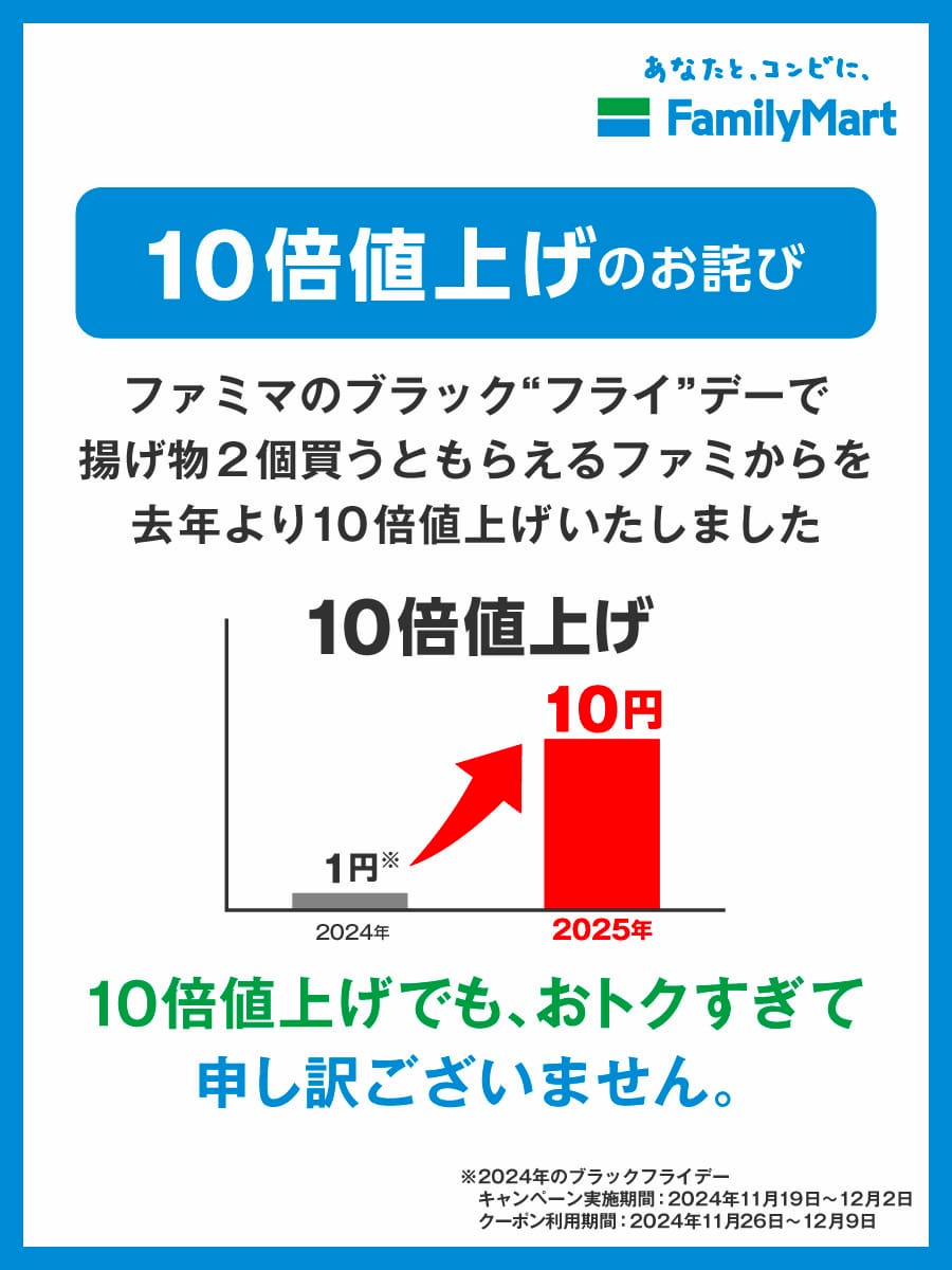 「10倍値上げのお詫び」 ファミリーマート、ブラックフライデーの「お詫び風」投稿が話題に