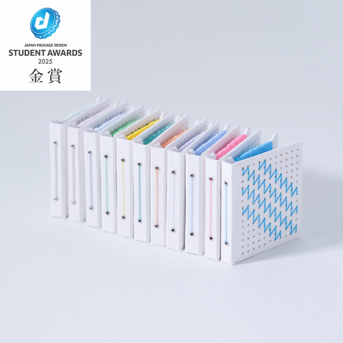 作品コンセプト:糸をまとめて保管すると、どんな色や太さだったかわからなくなることがあった。そこで、本のようにめくって楽しめる二つ折り構造を考えた。裏表紙は糸の収納スペース、背表紙の穴から1本の糸を通して特徴をひと目で確認できる。表紙に糸を自由に通すことで模様が生まれ、使う人自身が作品を完成させる楽しさと手仕事のぬくもりを感じられるデザインになっている