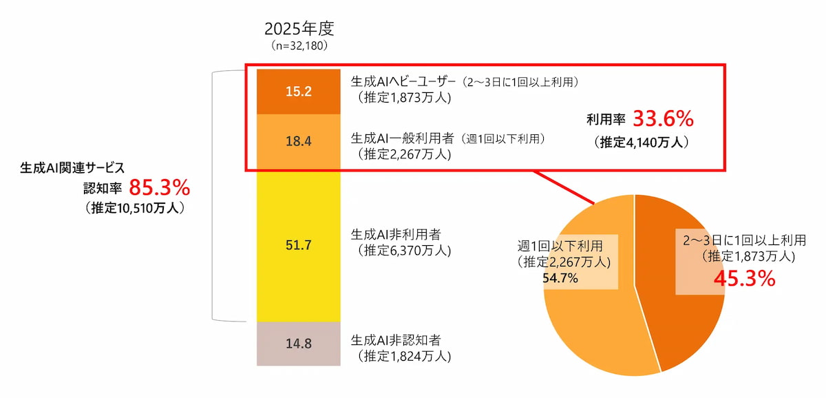 生活者全体の85.3%が生成AIを認知し、33.6%が生成AIを利用。利用者の45.3%が2~3日に1回以上利用するヘビーユーザーという結果に。