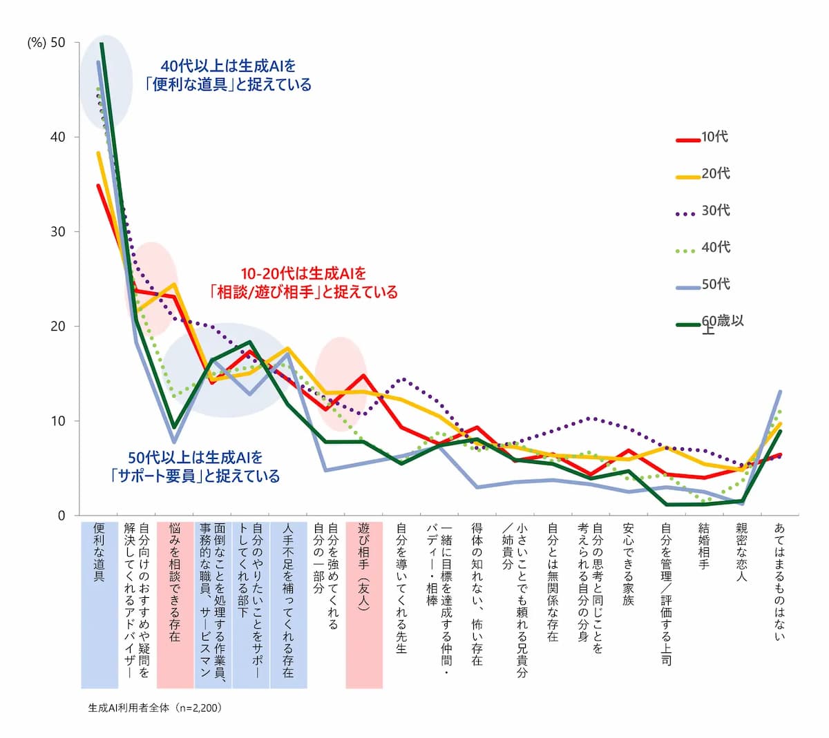生成AIは、10代にとっては「悩みを相談できる相手」「遊び相手」として、50代以上にとっては「サポート要員」として認識されている傾向が見えた。