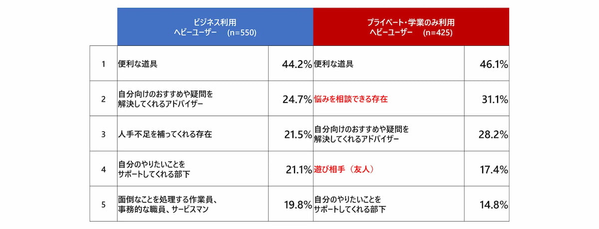 また、生成AI利用者の92.6%がプライベート・学業で使用しており、「仕事のためのツール」から「生活の中の相棒」へと立ち位置が変化しているのではないか、と同社は分析している。そのほか、ヘビーユーザーにおいては、プライベート利用者はAIを“相談相手”、ビジネス利用者は“仕事のサポーター”と捉え方に差が出たという。