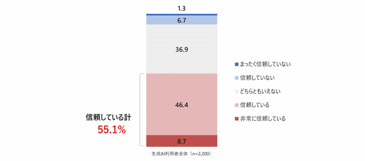 さらに、生成AIの情報を「信頼している」と答えたのは利用者の過半数にあたる55.1%。一方、「AIだけでは十分ではない。他のメディアからの情報も必要」と回答した人も48.3%と多く、情報源の使い分けが進んでいることも垣間見えた。