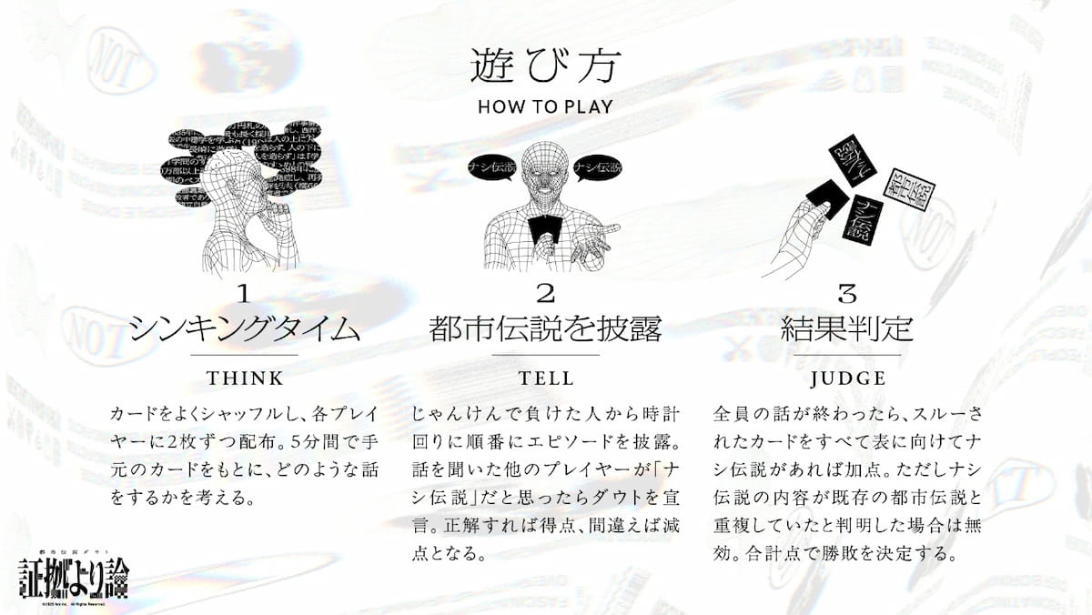 これらの背景を踏まえ企画されたのが、今回のゲーム。不確かだが魅力的な「都市伝説」を疑いながら聞くゲーム「都市伝説ダウト『証拠より論』」だ。自分自身が“でっちあげの都市伝説”で他者を騙す役割を担うことで、自分も同じように騙されているかもしれないという逆説的な気づきを与える効果も期待し、開発された。