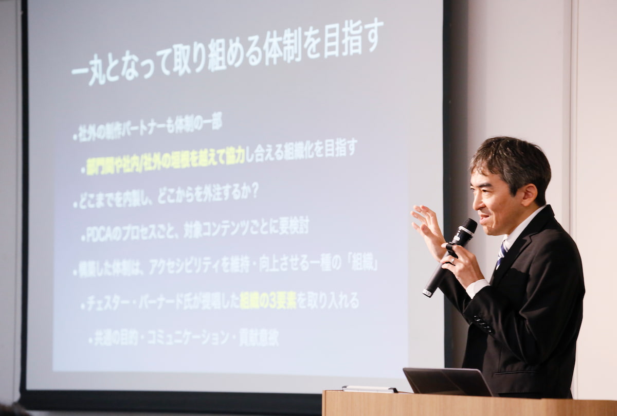 体制構築には、「プロセス」の定義と並行して、現場の担当者が主体的に取り組む「カルチャー」の醸成も重要だと説く。また、部門間や社内/社外の垣根を越え、制作パートナーとも連携し、組織全体で協力し合える体制を築くこと、そして経営学者のチェスター・バーナード氏がかつて提唱した組織の3要素(共通の目的、コミュニケーション、貢献意欲)を意識した取り組みが、アクセシビリティの浸透につながると述べた。